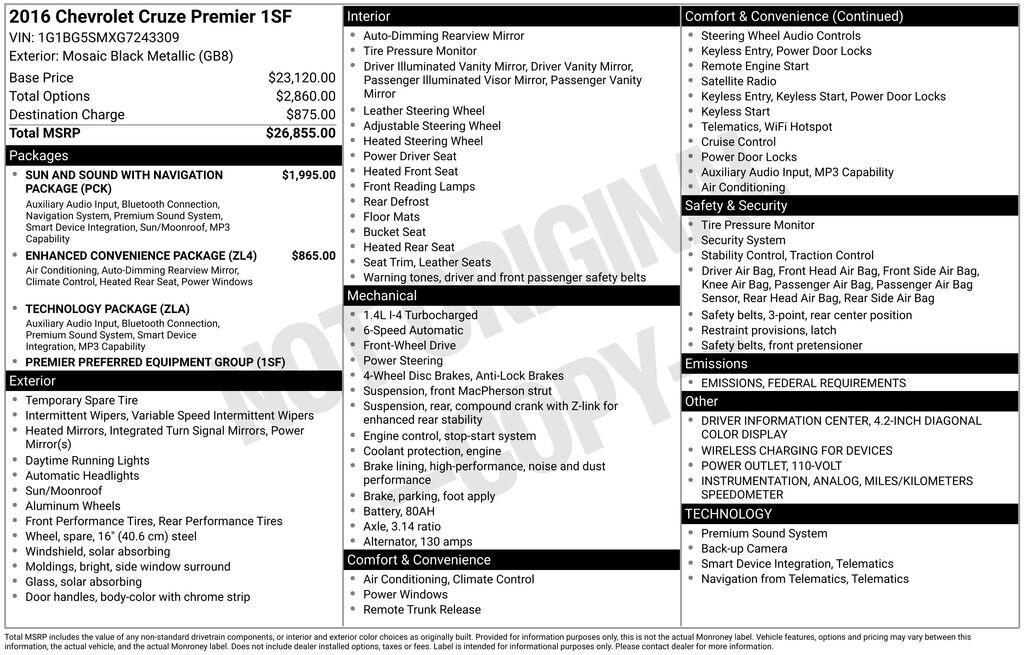 Used 2016 ChevroletCruze Premier Sedan 4-Cylinder Turbo DOHC CVVT