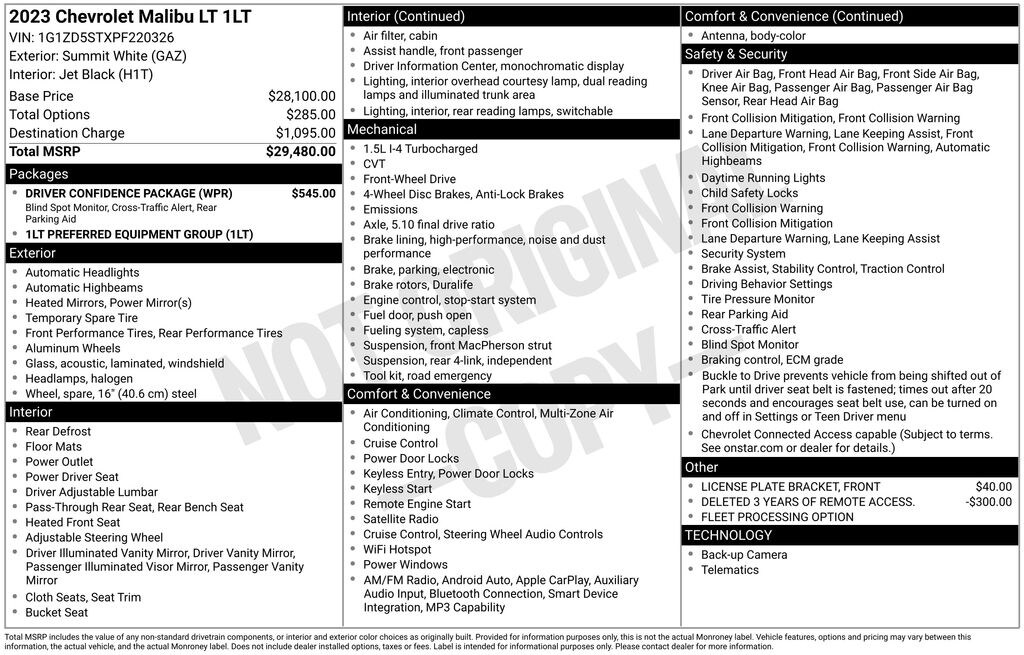 Gregg Young Ford is very proud to offer this charming-looking 2023 Chevrolet Malibu LT in Summit White, ONE OWNER CARFAX, Jet Black Cloth, 17" Aluminum Wheels, 4-Wheel Disc Brakes, 6 Speakers, 6-Speaker Audio System Feature, 6-Way Manual Front Passenger Seat Adjuster, 8-Way Power Driver Seat Adjuster, ABS brakes, Air Conditioning, Alloy wheels, AM/FM radio: SiriusXM, Apple CarPlay/Android Auto, Auto High-beam Headlights, Automatic temperature control, Brake assist, Bumpers: body-color, Compass, Delay-off headlights, Deleted 3 Years of Remote Access, Driver Confidence Package, Driver door bin, Driver vanity mirror, Dual front impact airbags, Dual front side impact airbags, Electronic Stability Control, Emergency communication system: OnStar and Chevrolet connected services capable, Exterior Parking Camera Rear, Four wheel independent suspension, Front anti-roll bar, Front Bucket Seats, Front Center Armrest, Front dual zone A/C, Front License Plate Bracket, Front reading lights, Fully automatic headlights, Heated door mirrors, Heated Driver & Front Passenger Seats, Heated front seats, Illuminated entry, Knee airbag, Lane Change Alert w/Side Blind Zone Alert (DISC), Low tire pressure warning, Occupant sensing airbag, Outside temperature display, Overhead airbag, Overhead console, Panic alarm, Passenger door bin, Passenger vanity mirror, Power door mirrors, Power Driver Lumbar Control Seat Adjuster, Power driver seat, Power steering, Power windows, Preferred Equipment Group 1LT, Premium audio system: Chevrolet Infotainment 3 Plus, Premium Cloth Seat Trim, Radio data system, Radio: Chevrolet Infotainment 3 System, Rear anti-roll bar, Rear Cross Traffic Alert (DISC), Rear Park Assist, Rear reading lights, Rear seat center armrest, Rear side impact airbag, Rear window defroster, Remote keyless entry, Security system, SiriusXM Radio, Speed control, Split folding rear seat, Steering wheel mounted audio controls, Tachometer, Telescoping steering wheel, Tilt steering wheel, Traction control, Trip computer, Variably intermittent wipers, Voltmeter, Wireless Apple CarPlay/Android Auto. 1LT