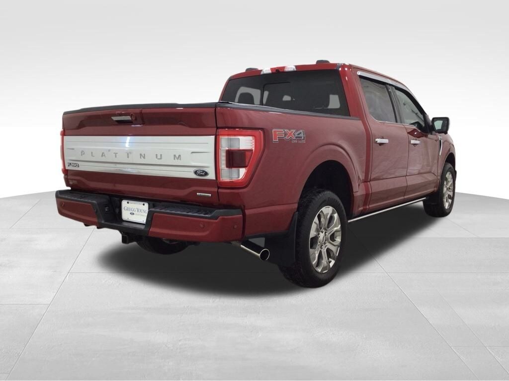 Gregg Young Ford is pumped up to offer this rock solid 2022 Ford F-150 Platinum in Rapid Red Metallic Tinted Clearcoat, 4WD, 20" Polished Aluminum Wheels, 360 Degree Camera, 4-Wheel Disc Brakes, 4x4 FX4 Off-Road Bodyside Decal, 8 Speakers, ABS brakes, Active Park Assist 2.0, Active Park Assist 2.0 Removal, Adjustable pedals, Air Conditioning, Alloy wheels, AM/FM radio: SiriusXM with 360L, Auto High-beam Headlights, Auto Start-Stop Removal, Auto tilt-away steering wheel, Auto-dimming door mirrors, Auto-dimming Rear-View mirror, Automatic temperature control, Bed Utility Package, BlueCruise, BoxLink, Brake assist, Bumpers: body-color, Class IV Trailer Hitch Receiver, Compass, Delay-off headlights, Driver door bin, Driver vanity mirror, Dual front impact airbags, Dual front side impact airbags, Electronic Stability Control, Emergency communication system: SYNC 4 911 Assist, Equipment Group 701A High, Extended Range 36 Gallon Fuel Tank, Exterior Parking Camera Rear, Ford Co-Pilot360 Active 2.0, Front anti-roll bar, Front Bucket Seats, Front Center Armrest, Front dual zone A/C, Front fog lights, Front reading lights, Front wheel independent suspension, Fully automatic headlights, FX4 Off-Road Package, Garage door transmitter, Heated door mirrors, Heated front seats, Heated rear seats, Heated steering wheel, Hill Descent Control, Illuminated entry, Integrated Trailer Brake Controller, LED Box Lighting, LED Sideview Mirror Spotlights, Low tire pressure warning, Max Recline Driver & Passenger Seat, Max Trailer Tow Package, Memory seat, Monotube Rear Shocks, Occupant sensing airbag, Off-Road Tuned Front Shock Absorbers, Outside temperature display, Overhead airbag, Overhead console, Panic alarm, Passenger door bin, Passenger vanity mirror, Pedal memory, Power door mirrors, Power driver seat, Power passenger seat, Power steering, Power Tailgate, Power windows, Pro Power Onboard - 2KW, Pro Trailer Backup Assist, Radio data system, Radio: B&O Sound System by Bang & Olufsen, Radio: B&O Unleashed Sound System by Bang & Olufsen, Rain sensing wipers, Rear reading lights, Rear seat center armrest, Rear step bumper, Rear window defroster, Remote keyless entry, Rock Crawl Mode, Security system, Speed control, Speed-sensing steering, Split folding rear seat, Steering wheel memory, Steering wheel mounted audio controls, SYNC 4 w/Enhanced Voice Recognition, Tachometer, Tailgate Step w/Tailgate Work Surface, Telescoping steering wheel, Tilt steering wheel, Traction control, Tray Style Floor Liner, Trip computer, Turn signal indicator mirrors, Twin Panel Moonroof, Unique Multi-Contour Leather Bucket Seats, Variably intermittent wipers, Ventilated front seats, Voltmeter.
