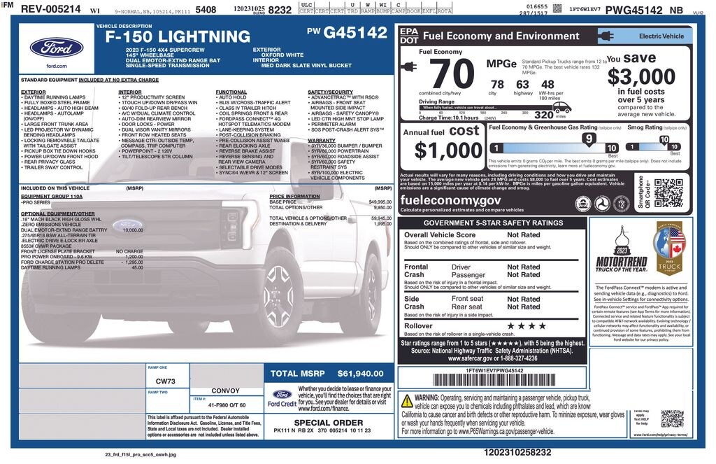 Gregg Young Ford is honored to offer this gorgeous-looking 2023 Ford F-150 Lightning Pro in Oxford White, 4-Wheel Disc Brakes, 6 Speakers, ABS brakes, Air Conditioning, Alloy wheels, Auto High-beam Headlights, Auto-dimming Rear-View mirror, Automatic temperature control, Brake assist, Compass, Delay-off headlights, Driver door bin, Driver vanity mirror, Dual front impact airbags, Dual front side impact airbags, Electronic Stability Control, Emergency communication system: SYNC 4 911 Assist, Equipment Group 110A Standard, Forward Sensing System, Four wheel independent suspension, Front anti-roll bar, Front Bucket Seats, Front Center Armrest, Front dual zone A/C, Front License Plate Bracket, Front reading lights, Fully automatic headlights, Heated door mirrors, Heated front seats, Knee airbag, Low tire pressure warning, Navigation System, Occupant sensing airbag, Outside temperature display, Overhead airbag, Overhead console, Panic alarm, Passenger door bin, Passenger vanity mirror, Power door mirrors, Power steering, Power windows, Pro Power Onboard - 9.6 kW, Radio data system, Radio: FM Stereo w/6 Speakers, Rear anti-roll bar, Rear step bumper, Remote keyless entry, Security system, Speed control, Speed-sensing steering, Split folding rear seat, Steering wheel mounted audio controls, SYNC 4 w/Enhanced Voice Recognition, Telescoping steering wheel, Tilt steering wheel, Traction control, Trip computer, Variably intermittent wipers, Vinyl Bucket Heated Front Seats, Wheels: 18" Machined w/Black High Gloss Pockets.