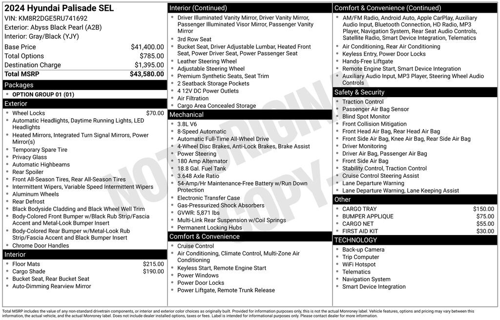 Gregg Young CDJR is pumped up to offer this handsome-looking 2024 Hyundai Palisade SEL in Abyss Black Pearl, CLEAN CARFAX, ONE OWNER, Apple CarPlay & Android Auto, Exterior Parking Camera Rear, Heated front seats, Illuminated entry, Navigation System, Option Group 01, Power driver seat, Power Liftgate, Remote keyless entry, Tilt steering wheel. V6