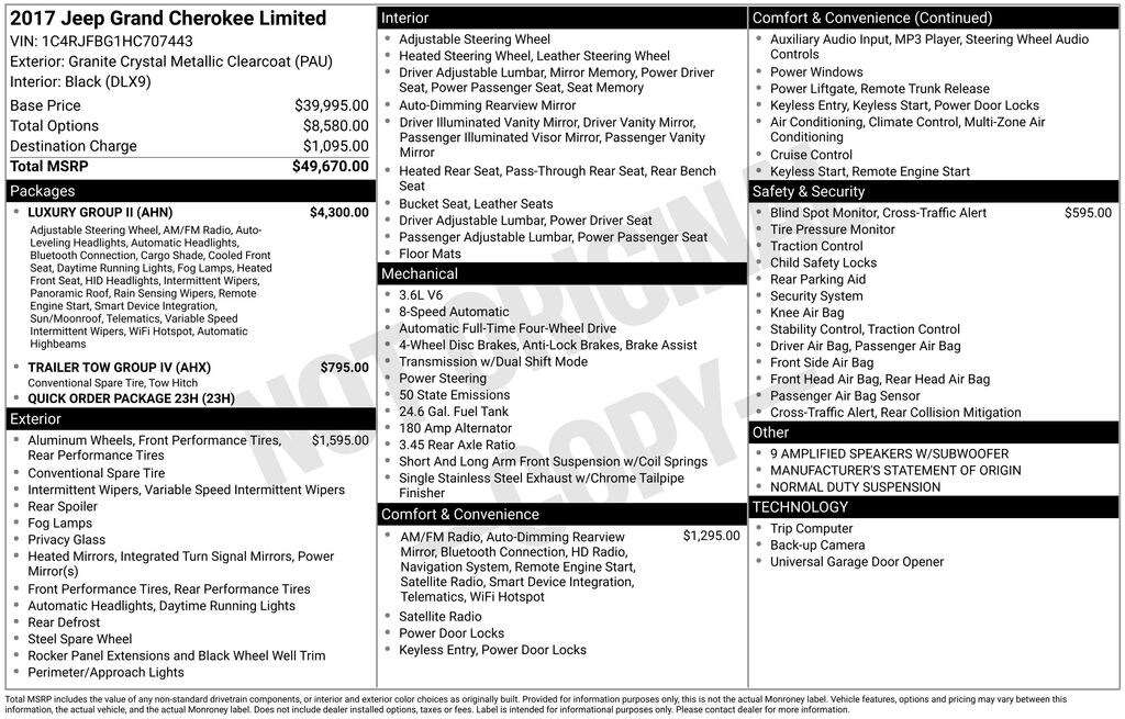Gregg Young CDJR is honored to offer this outstanding 2017 Jeep Grand Cherokee Limited in Granite Crystal Metallic Clearcoat, Recent Arrival! 506 Watt Amplifier, 7 & 4 Pin Wiring Harness, 9 Amplified Speakers w/Subwoofer, Auto High Beam Headlamp Control, Automatic Headlamp Leveling System, Bi-Xenon High-Intensity Discharge Headlamps, Cargo Compartment Cover, Class IV Receiver Hitch, Dual-Pane Panoramic Sunroof, GPS Navigation, Heated front seats, Heavy-Duty Engine Cooling, Illuminated entry, Leather Trimmed Seats w/Perforated Inserts, LED Daytime Running Headlamps, LED Fog Lamps, Luxury Group II, ParkView Rear Back-Up Camera, Power driver seat, Power Liftgate, Power Tilt/Telescope Steering Column, Quick Order Package 23H, Radio: Uconnect 3C w/8.4" Display, Rain Sensitive Windshield Wipers, Rear Load Leveling Suspension, Remote keyless entry, Tilt steering wheel, Trailer Tow Group IV, Ventilated Front Seats. 3.6L V6 24V VVT