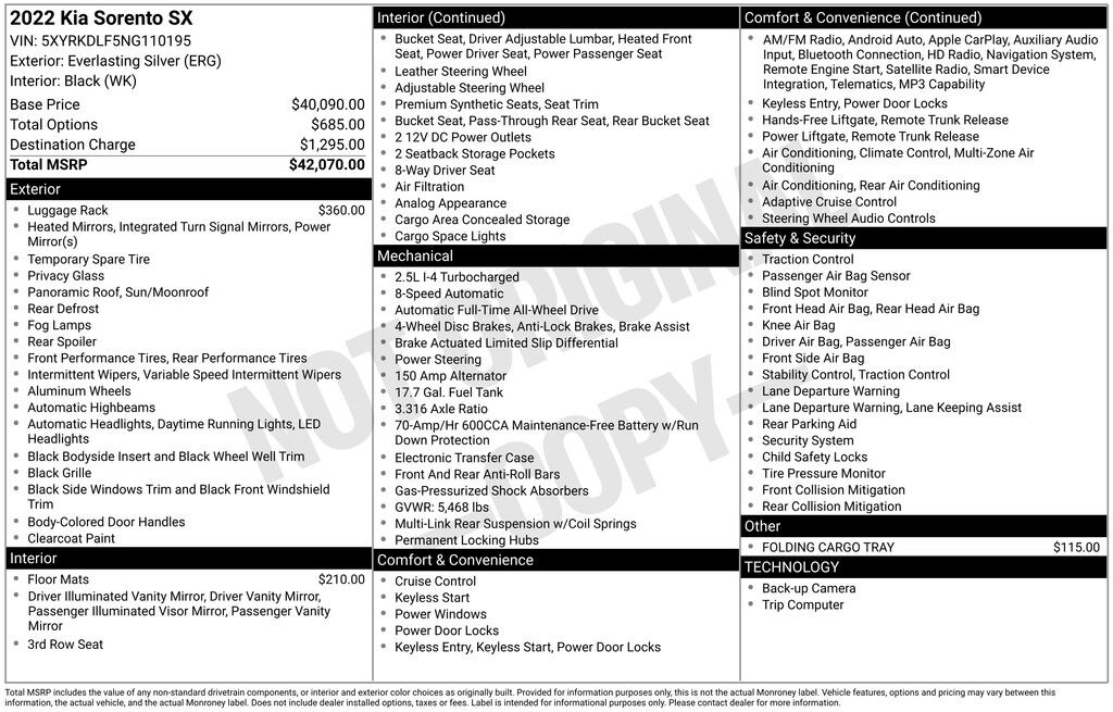 Gregg Young Ford is proud to offer this handsome 2022 Kia Sorento SX in Everlasting Silver, AWD, 3.316 Axle Ratio, 3rd row seats: split-bench, 4-Wheel Disc Brakes, 6 Speakers, ABS brakes, Air Conditioning, Alloy wheels, AM/FM radio: SiriusXM, Apple CarPlay & Android Auto, Auto High-beam Headlights, Automatic temperature control, Brake assist, Bumpers: body-color, Carpeted Floor Mats, Cross Bars (Interim), Driver door bin, Driver vanity mirror, Dual front impact airbags, Dual front side impact airbags, Electronic Stability Control, Emergency communication system: UVO Link, Exterior Parking Camera Rear, Folding Cargo Tray, Four wheel independent suspension, Front anti-roll bar, Front Bucket Seats, Front Center Armrest, Front dual zone A/C, Front reading lights, Heated door mirrors, Heated Front Bucket Seats, Heated front seats, Illuminated entry, Knee airbag, Leather steering wheel, Low tire pressure warning, Navigation System, Occupant sensing airbag, Outside temperature display, Overhead airbag, Overhead console, Panic alarm, Passenger door bin, Passenger vanity mirror, Power door mirrors, Power driver seat, Power Liftgate, Power moonroof, Power passenger seat, Power steering, Power windows, Radio data system, Radio: AM/FM Audio System, Rear air conditioning, Rear anti-roll bar, Rear reading lights, Rear window defroster, Rear window wiper, Remote keyless entry, Roof rack: rails only, Security system, Smart Key w/ Push Button and Remote Start, Speed control, Speed-sensing steering, Split folding rear seat, Spoiler, Steering wheel mounted audio controls, SynTex Artificial Leather Seat Trim, Tachometer, Telescoping steering wheel, Tilt steering wheel, Traction control, Trip computer, Turn signal indicator mirrors, Variably intermittent wipers, Wheels: 8.5J x 20" Gloss Black Alloy.